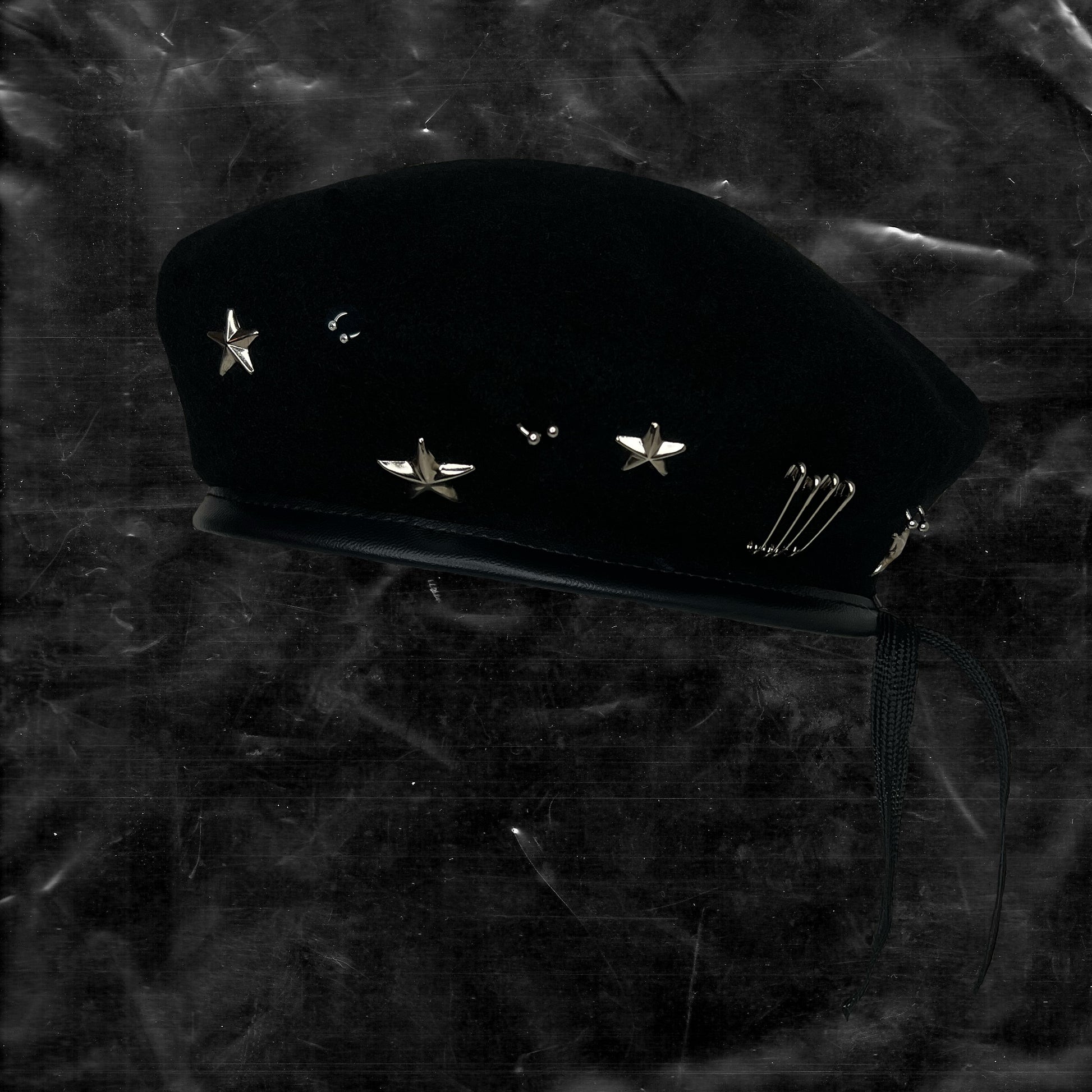 PLS IMA STAR BERET | cotton lined beret featuring a statement star pin, star studs, piercings and safety pin decor. each beret is handmade, so slight variations make every piece one of a kind. free shippin at checkout!